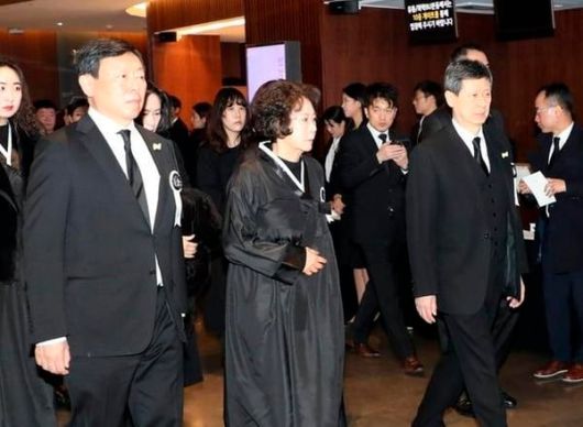 신동빈 롯데그룹 회장(앞줄 왼쪽부터), 신영자 전 롯데장학재단 이사장, 신동주 SDJ코퍼레이션 회장(전 일본 롯데홀딩스 부회장)이 2020년 1월 22일 서울 송파구 롯데월드타워에서 열린 고 신격호 롯데그룹 명예회장의 영결식에 입장하고 있다./연합뉴스 |