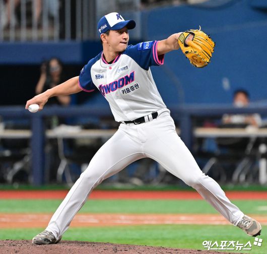 (엑스포츠뉴스 고척, 김한준 기자) 5일 오후 서울 구로구 고척스카이돔에서 열린 '2025 신한 SOL Bank KBO리그' 한화 이글스와 키움 히어로즈의 경기, 8회초 2사 1루 키움 주승우가 공을 힘차게 던지고 있다.김한준 기자 kowel@xportsnews.com