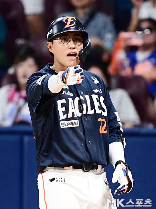 8회초 2사 1루에서 한화 채은성이 키움 바뀐 투수 주승우를 상대로 역전 투런홈런을 쏘아올린 후 기뻐하고 있다.