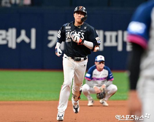 (엑스포츠뉴스 고척, 김한준 기자) 5일 오후 서울 구로구 고척스카이돔에서 열린 '2025 신한 SOL Bank KBO리그' 한화 이글스와 키움 히어로즈의 경기, 8회초 2사 1루 한화 채은성이 투런 홈런을 날린 후 그라운드를 돌고 있다.김한준 기자 kowel@xportsnews.com