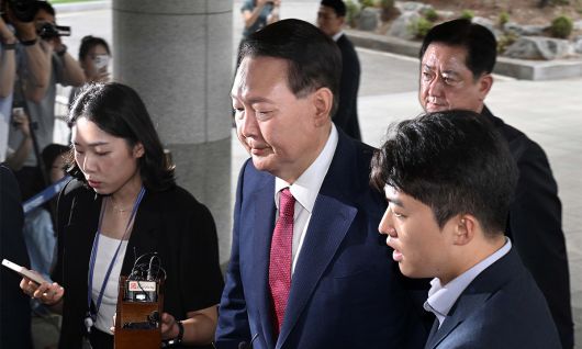 윤 전 대통령은 5일 오전 9시1분쯤 서울 서초구 서울고검에 도착했다. 네이비 정장에 붉은 넥타이를 맨 윤 전 대통령은 취재진 질문에 답하지 않은 채 곧바로 고검 6층 사무실로 이동했다. 특검도 별도 티타임 없이 바로 윤 전 대통령에 대한 조사를 시작했다.