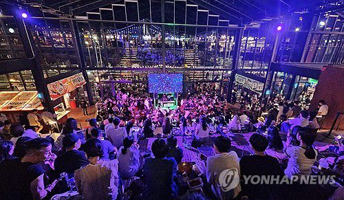 (부산=연합뉴스) 강선배 기자 = 부산지역이 올해 들어 가장 더운 날씨를 보인 5일 오후 핫플레이스로 알려진 수영구 밀락더마켓 야시장 '마켓나이트'에서 이용객들이 스탠드형 계단에서 광안대교 풍경을 감상하며 음악과 음식을 즐기고 있다. 2025.7.5