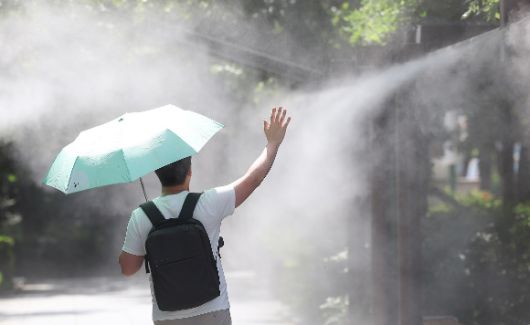 대구 중구 국채보상운동기념공원에 쿨링포그(안개형 냉각수)가 가동 중인 가운데 한 시민이 양산을 들고 이동하고 있다. [사진=연합뉴스] |