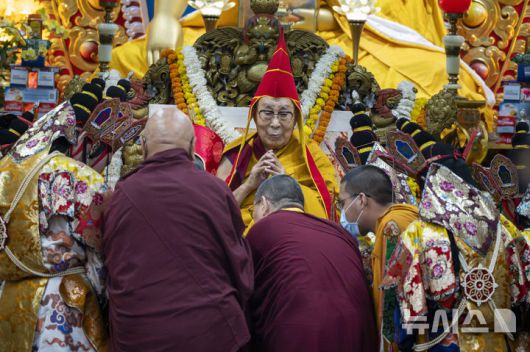 [다름살라=AP/뉴시스] 티베트 불교 최고 정신적 지도자 달라이 라마 14세가 90번째 생일을 하루 앞둔 5일 인도 북부 다람살라에서 열린 장수기원 법회에 참석하고 있다. 2025.07.05 |