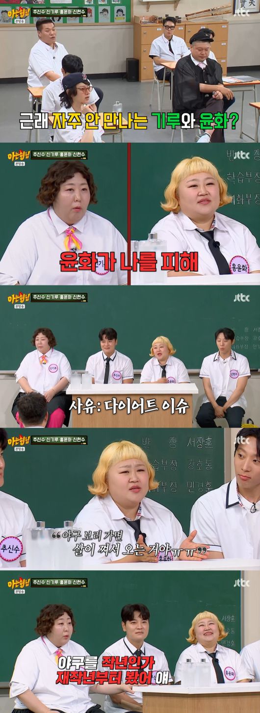 그런가 하면 최근 신기루와 홍윤화는 만나는 횟수가 줄었다고 전해졌다. 신기루가 "윤화가 나를 피한다"고 하자 홍윤화는 "내가 요즘 다이어트를 한다. 야구를 보러 가면 살이 쪄서 오더라"라고 그 이유를 털어놨다.