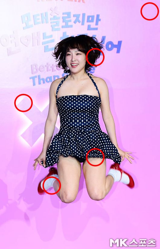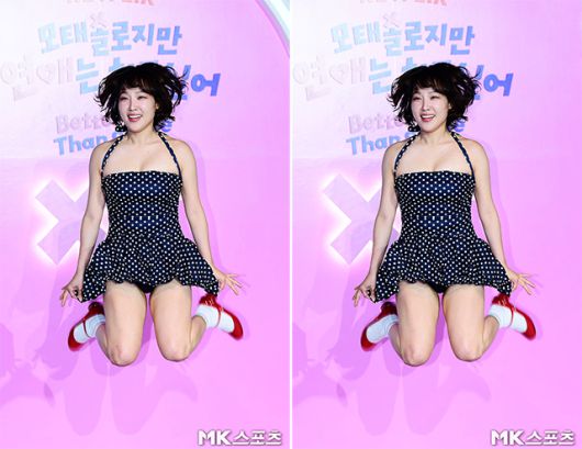 이날 현장에서 이은지는 도트 수영복 스타일 원피스에 하얀 양말과 빨간 메리제인 힐을 매치한 패션으로 무대에 올라 속바지가 보일 정도로 아찔한 점프 퍼포먼스를 선보였습니다.