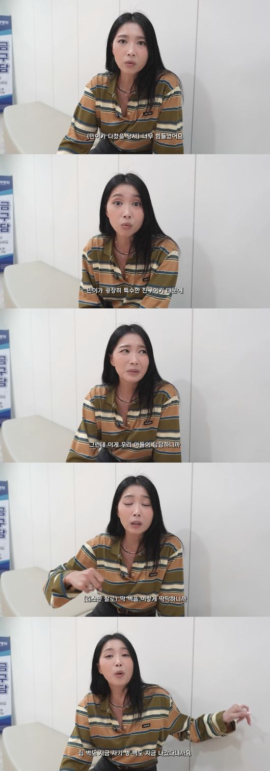 오윤아는 “우리 아들이 답답하니까 (깁스 한 팔로) 벽을 친다. 벽을 치면 벽이 무너지는 게 너무 재밌나 보다. 집 벽, 자기 방 벽도 지금 나갔다. 그래서 세 번을 또 깁스를 했다”라고 말했다.