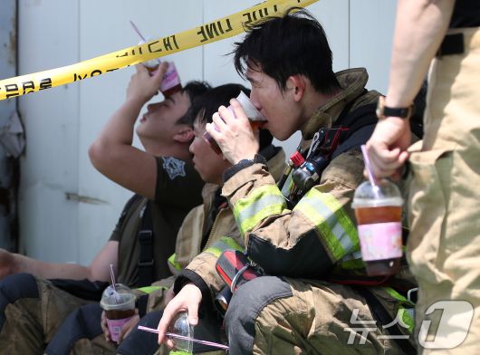 4일 오후 대구 서구 이현동 물류창고 화재 현장에서 진화를 마친 소방관들이 땀에 흠뻑 젖은 채 누군가 건넨 아이스커피를 마시며 더위를 식히고 있다. 2025.7.4/뉴스1 ⓒ News1 공정식 기자 |