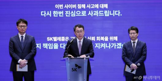 유영상 SK텔레콤 대표이사가 4일 서울 중구 SKT타워에서 열린 기자회견에서 정부의 해킹 사태 관련 최종 조사결과 발표 관련 입장 및 향후 계획을 발표하고 있다. /사진=뉴스1 |