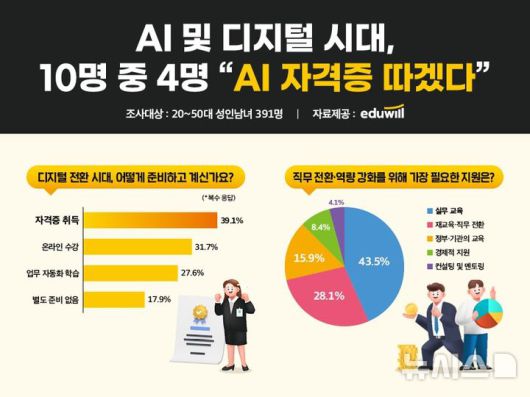 에듀윌은 20~50대 성인남녀 391명을 대상으로 'AI 및 디지털 전환 시대, 직업의 변화에 대한 인식'에 대한 설문조사 결과를 6일 발표했다.
