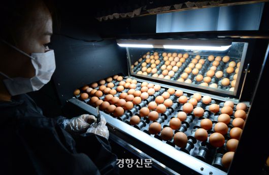 경기 양주의 한 산란계 농장에서 직원이 달걀 분류 작업을 하고 있다. 경향신문 자료 |
