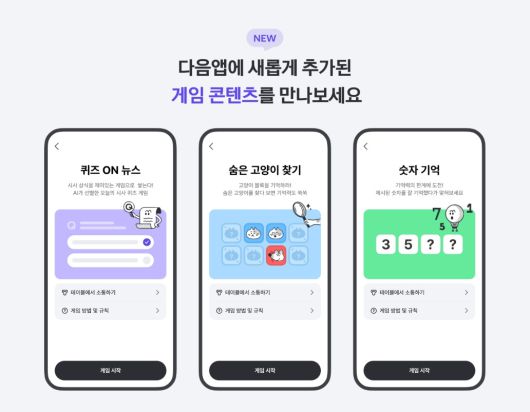 6일 다음에 따르면 최근 모바일 다음의 뉴스 탭과 펀(FUN) 탭에서 이용할 수 있는 게임을 제공하고 있다. 시사 상식 퀴즈인 '퀴즈 온(ON) 뉴스', 카드 뒤집기 게임인 '숨은 고양이 찾기', 기억력 테스트 게임인 '숫자 기억' 총 3가지다. 다음 측은 "이용자에게 더 풍부한 콘텐츠 경험을 제공하기 위해 모바일 다음에 '게임온다음(Game On Daum)' 서비스를 새롭게 선보였다"고 밝혔다.