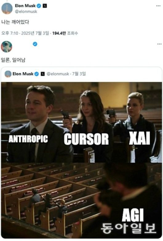 머스크가 3일(현지 시간) 올린 사진은 미국 드라마 ‘퍼슨 오브 인터레스트(Person of Interest)’ 속 장면들을 편집한 것이다. AI 스타트업 앤트로픽(Anthropic), 커서(Cursor), 머스크가 이끄는 xAI가 차례로 총을 겨누고 있다. 범용 인공지능(AGI)는 이들 모두를 향해 조준하고 있다.