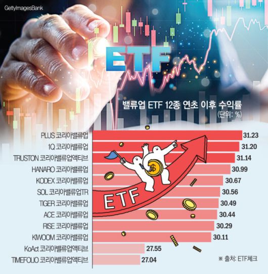 현재까지는 국내 상장 12종 밸류업 ETF(패시브형 9종·액티브형 3종) 중 대부분이 코스피 지수 성적을 초과하고 있다. 연초 이후 ‘PLUS 코리아밸류업(31.23%)’을 비롯해 ‘1Q 코리아밸류업(31.20%)’, ‘TRUSTON 코리아밸류업액티브(31.14%)’, ‘HANARO 코리아밸류업(30.99%)’ 등이 코스피 수익률(27.29%)을 많게는 4%포인트(p)가량 상회한다. 밸류업 ETF 순자산 총액은 이들 상품이 상장한 지난해 11월 초 4961억 원에서 지난달 말 7051억 원으로 불어났다.