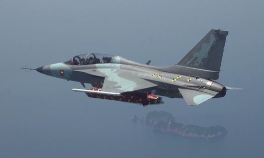 FA-50 시제기가 국산 장거리 공대지미사일을 장착한 채 비행하고 있다. 방위사업청 제공 |
