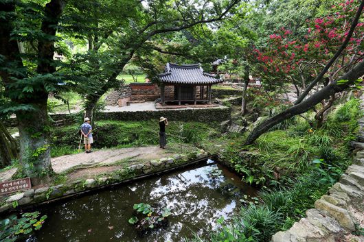 이에 비해 우리나라 ‘선비 정원’의 정수라 할 담양의 소쇄원은 계곡과 언덕 등 원래의 자연 지형을 최대한 보존하며, 그 흐름에 따라 건물을 배치했다. 예를 들어 시냇물을 중심축 삼아 주변의 굴곡진 경사면을 계단식(노단식)으로 처리해 자연스러운 지형미를 살렸다. 제월당이나 광풍각 등의 건물은 계곡 가까이에 세워져 정자에서 흐르는 물과 자연경관을 감상할 수 있게 했고, 연못과 물레방아는 자연의 물길을 따라 설치해 자연과 어우러지도록 했다. 자연의 빼어난 경관을 최대한 이용하려 할 뿐 여기에는 과함도 형식도 없다.