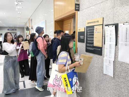 서울 송파구 서울동부지법 경매 입찰법정 앞이 경매에 참여한 시민들로 붐비고 있다. [한주형 기자] |