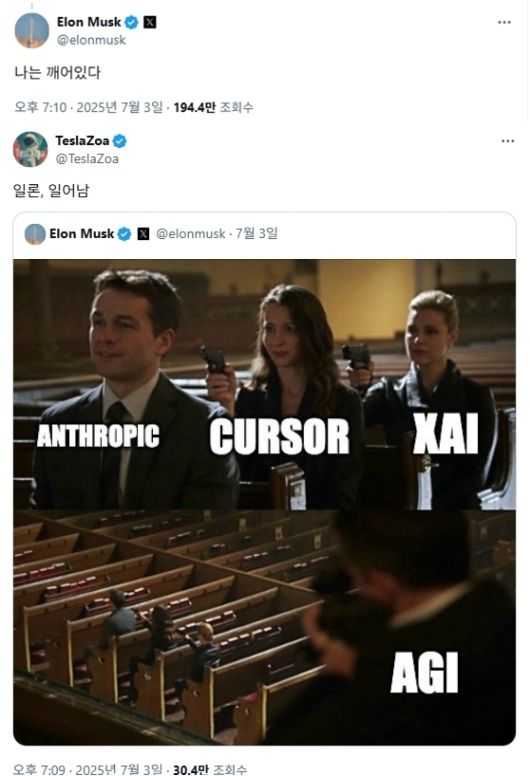머스크는 지난 3일(현지시간) 엑스 계정에 인공지능(AI) 경쟁구도를 풍자한 밈(meme·온라인 유행 콘텐츠)을 올렸습니다.