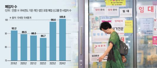 폐업자 수는 2019년 92만2159명에서 3년 연속 감소해 2022년 86만7292명까지 줄었다. 그러나 2023년에는 11만 명 넘게 늘면서 98만6487명을 기록했고, 지난해까지 2년 연속 증가하며 100만 명대로 진입했다. 코로나19 팬데믹 시기 누적된 사업 부진과 고금리로 인한 연체율 악화 등으로 2023년부터 폐업자가 많이 늘어난 것으로 분석된다.