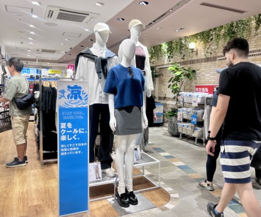 일본 도쿄의 한 유니클로 의류 판매장. ‘여름을 쿨하게 즐겁게’ 라는 헤드 카피로 기획전을 하고 있다. 도쿄 명희진 특파원 |