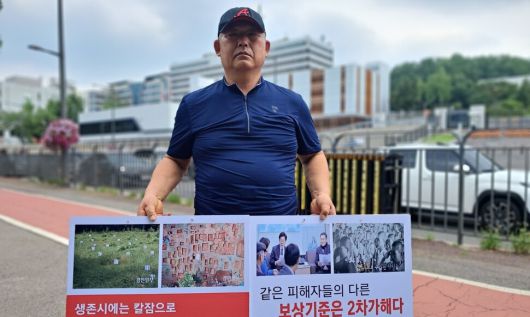 선감학원 피해생존자 이주성(65)씨가 4일 오후 서울 용산 대통령실 맞은편 거리에서 여러 구호가 적힌 팻말을 앞에 두고 섰다. 팻말 문구 중에 “생존 시에는 칼잠으로, 죽어서는 웅크린 채 암매장, 발굴 후에는 180명을 10평에 합장?”이라는 문장이 눈길을 끌었다. 1인시위에 나선 건 3일부터다. 매일 저녁, 같은 장소에 나올 계획이다. 이날은 직장에 하루 휴가를 낸 터라 오후 3시께 시위를 시작했다. 현장에서 한겨레와 만난 이씨는 “죽은 친구들에게 최소한의 예의를 지키기 위해 나섰다”고 말했다.