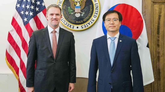 ▲ 여한구 산업통상자원부 통상교섭본부장은 미국무역대표부(USTR)에서 제이미슨 그리어 미국 무역대표부 대표와 면담을 가졌다.