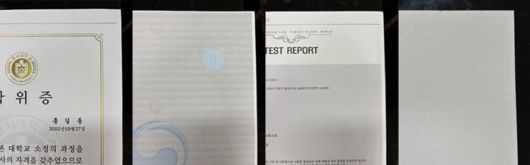 인비저블 보안코드를 적용한 스마트 보안페이퍼 샘플. 왼쪽부터 학위증, 행정서식지, 시험성적서, 사무용지.(더코더 제공) |