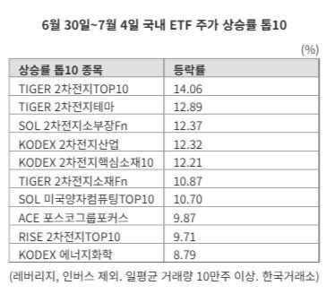 6일 한국거래소에 따르면 지난달 30일부터 이달 4일까지 ETF 시장에서 가장 높은 수익률을 기록한 상품은 'TIGER 2차전지TOP10'으로 14.06% 상승했다. 이어 'TIGER 2차전지테마'(12.89%), 'SOL 2차전지소부장Fn'(12.37%), 'KODEX 2차전지산업'(12.32%), 'KODEX 2차전지핵심소재10'(12.21%) 순으로 상위권을 형성됐다. 레버리지, 인버스 종목과 일평균 거래량 10만주 미만 종목은 집계에서 제외한 기준이다.