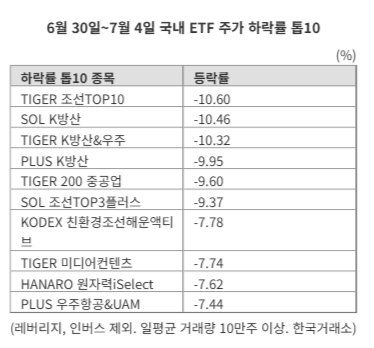반면 방산 및 조선 업종 관련 ETF들은 약세를 나타냈다. 'TIGER 조선TOP10'은 -10.60%, 'SOL K방산'은 -10.46%, 'TIGER K방산&우주'는 -10.32%, 'PLUS K방산'은 -9.95%를 기록했다. 'TIGER 200 중공업' 역시 9.60% 떨어졌다.