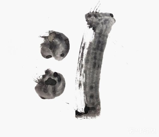 드디어 ‘아!’하는 소리와 함께 모음이 탄생하는 순간입니다. 글자는 사람의 입을 통해 터져나오는 말씨에서 시작됐습니다. 이를 기록하는 글씨에서 소리가 들리는 듯합니다. 장천 김성태 작가와 깊은 교류를 맺고 있는 배일동 명창(중요무형문화재 5호 판소리 이수자)의 깊은 울림통에서 터져나오는 ‘아~’ 소리를 듣는 듯하네요. 왼쪽에 사람(l)과 오른쪽에 하늘(·)이 만나니 오른쪽에 하늘이 있어 양(陽)이고 음은 ‘아’가 됩니다.