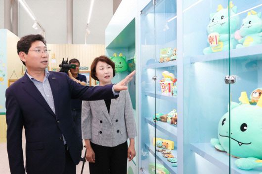 이상일 용인특례시장(왼쪽)과 유진선 용인시의회의장이 지난해 시청 1층 로비에 마련된 시 캐릭터 조아용 홍보존을 둘러보고 있다. /용인시 |
