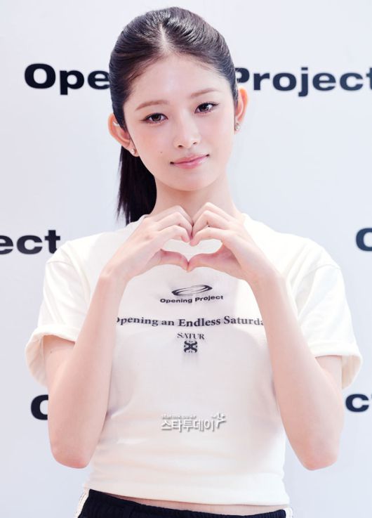 그룹 아이브 막내 레이가 브랜드 포토행사에 참석해 볼하트 포즈를 취하고 있다. |
