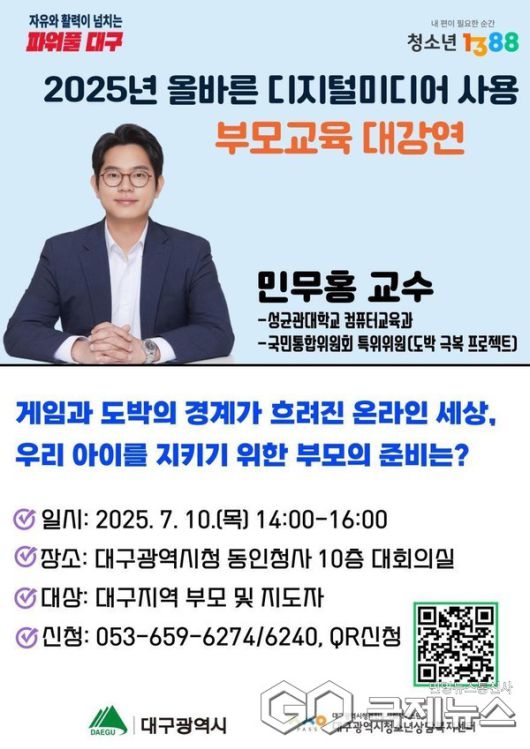 한편, 대구시는 "강의는 민무홍 성균관대학교 교수가 맡아 '게임과 도박의 경계가 흐려진 온라인 세상, 우리 아이를 지키기 위한 부모의 준비는?'이라는 주제로 현실적이고 실질적인 해법을 제시할 계획이며 민 교수는 국민통합위원회 특위위원으로 활동하며 도박 극복 프로젝트에 참여해 왔고, 정보보안 및 불법 도박 분야에서 다년간 전문성을 쌓아온 전문가로 잘 알려져 있다."고 밝혔다.