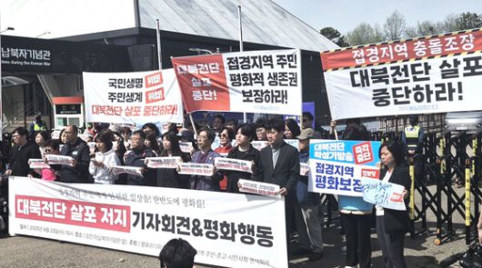 지난 4월 23일 오전 경기도 파주시 임진각에서 파주지역 시민단체 ‘평화위기파주비상행동’이 기자회견을 열고 납북자가족모임의 대북전단 살포 시도를 규탄하고 있다. 전익진 기자 |
