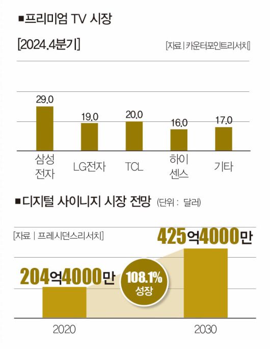 그러자 LG전자가 반격 카드를 꺼내들었다. 무기는 거대 디스플레이인 '디지털 사이니지'다. 디지털 사이니지는 디지털 디스플레이 장치를 사용한 정보 게시판이다. 건물 전면에 부착한 광고 간판, 스포츠 경기장 내 점수판 등이 모두 디지털 사이니지의 일종이다. 프리미엄 TV 시장과 별개로 새로운 마켓을 개척하겠다는 게 LG전자의 플랜이다.
