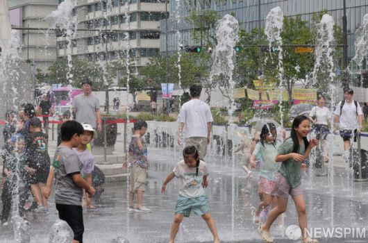 [서울=뉴스핌] 양윤모 기자 = 휴일을 맞아 서울의 기온이 33도까지 올라간 6일 오후 광화문광장 분수를 찾은 어린이들이 무더위를 식히고 있다. 2025.07.06 yym58@newspim.com |