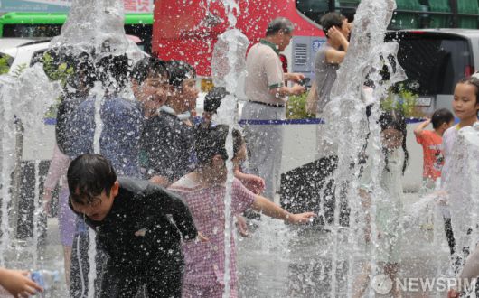 [서울=뉴스핌] 양윤모 기자 = 휴일을 맞아 서울의 기온이 33도까지 올라간 6일 오후 광화문광장 분수를 찾은 어린이들이 무더위를 식히고 있다. 2025.07.06 yym58@newspim.com