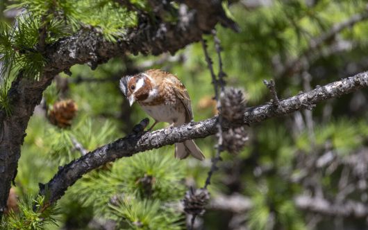 정수리 머리깃을 잔뜩 세운 흰머리멧새 수컷이 시베리아잎갈나무 가지에 앉아 주위를 살피고 있다. 정수리와 뺨, 가슴 위쪽의 흰색과 멱, 가슴 아래쪽의 적갈색이 어우러진 여름깃이 화려하다. 몽골 초원과 타이가 숲에서 번식하는 대표적인 새 중 하나다. 2014년 경기도 파주, 2023년 경기도 시흥, 2024년 강원도 철원에서 나타났다. |