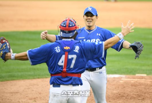 삼성 김재윤이 잠실야구장에서 열린 2024 KBO리그 LG와 플레이오프전 승리 후 강민호와 환호하고 있다. 잠실 | 최승섭기자 thunder@sportsseoul.com |