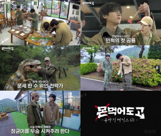 이날 몬스타엑스는 지난주에 이어 '쥬라기 레이스'를 진행했다. 앞서 1라운드 막바지에 셔누와 아이엠의 가방을 강탈한 민혁은 종료 후 셔누에게 잡혔다. 민혁은 허탈함에 게임 종료를 받아들이지 못하는 셔누에게 공룡알을 3개만 뺏는 것으로 합의를 마쳤고, 아이엠은 자존심을 지킨 채 빈털터리로 1라운드를 종료했다.
