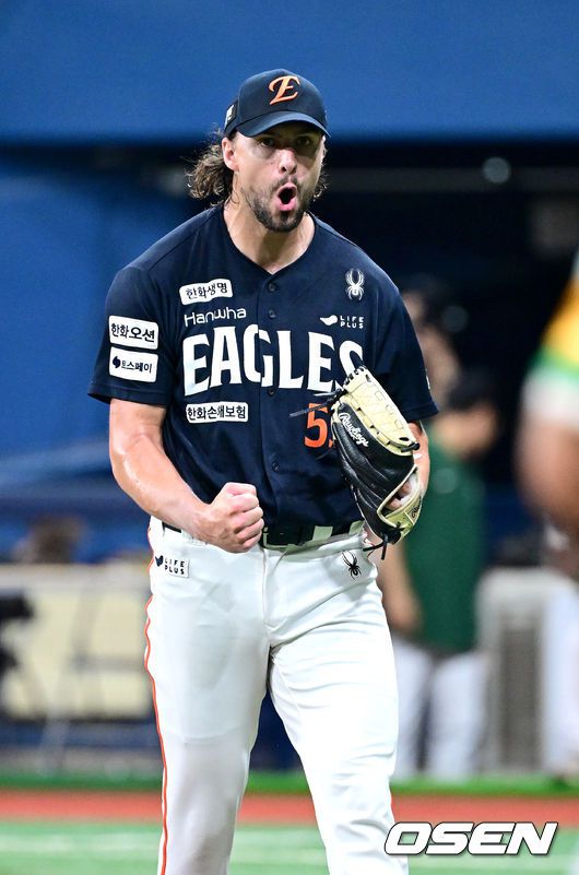 [OSEN=고척, 최규한 기자] 6일 서울 고척스카이돔에서 ‘2025 신한 SOL Bank KBO리그’ 키움 히어로즈와 한화 이글스의 경기가 열렸다. 홈팀 키움은 박주성, 방문팀 한화는 라이언 와이스를 선발로 내세웠다. 5회말 2사 만루 상황 키움 임지열을 삼진으로 이끌며 무실점으로 이닝을 마무리지은 한화 선발 와이스가 포효하고 있다. 2025.07.06 / dreamer@osen.co.kr