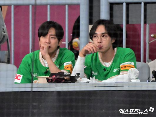 (엑스포츠뉴스 고척, 김한준 기자) 6일 오후 서울 구로구 고척스카이돔에서 열린 '2025 신한 SOL Bank KBO리그' 한화 이글스와 키움 히어로즈의 경기, 시구와 시타를 마친 배우 이상협과 가수 이석훈이 경기를 지켜보고 있다.김한준 기자 kowel@xportsnews.com