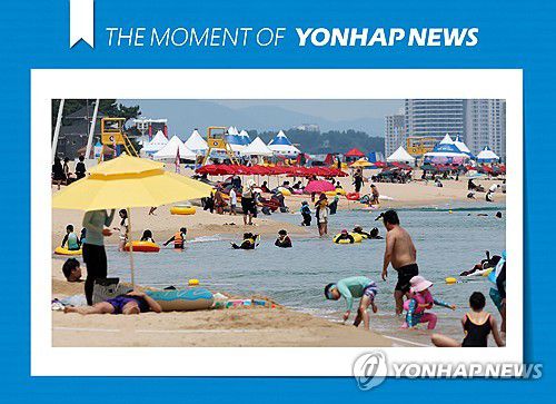 (강릉=연합뉴스) 유형재 기자 = 강원 강릉지역에 폭염경보와 7일째 열대야가 이어진 6일 경포해수욕장에서 피서객들이 무더위를 식히고 있다. 2025.7.6 [THE MOMENT OF YONHAPNEWS]