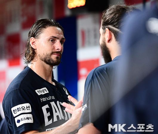 한화 선발 와이스가 6회말 수비를 마친 후 더그아웃에서 폰세와 악수를 나누고 있다.