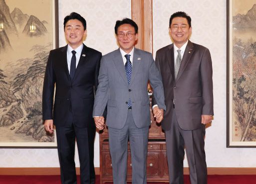김민석 국무총리(가운데)가 6일 서울 종로구 삼청동 총리공관에서 열린 고위당정협의회에서 더불어민주당 김병기 대표 직무대행 겸 원내대표(오른쪽), 강훈식 대통령 비서실장과 기념촬영을 하고 있다.(사진=연합뉴스) |