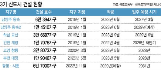 문제는 실제 입주까지 걸리는 시간이다. 왕숙·교산·창릉 등은 2019~2020년 지구 지정 이후 5~6년이 지난 2024년에야 착공이 이뤄졌다. 이에 따라 최초 입주 시점도 2028~2029년으로 잡혀 있다.