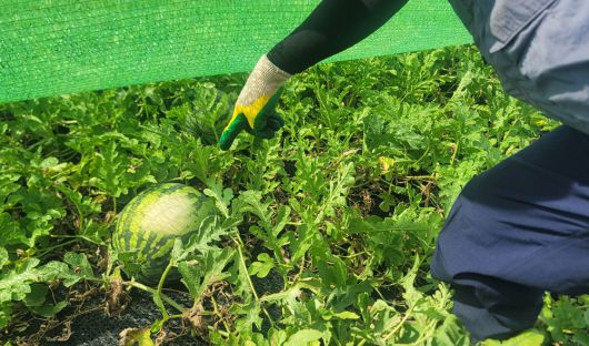 강한 햇볕으로 피해를 입은 수박. 고경호 기자 |