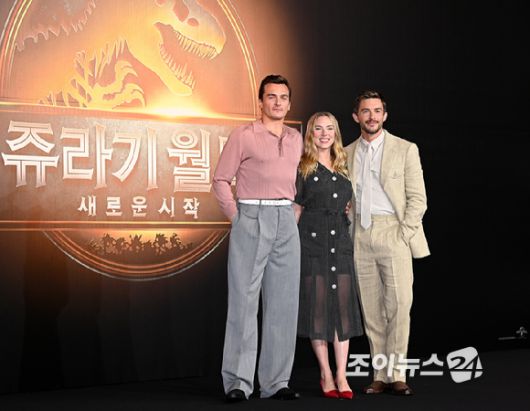 할리우드 배우 루퍼트 프렌드, 스칼렛 요한슨, 조나단 베일리가 1일 오후 서울 종로구 포시즌스 호텔 서울에서 열린 영화 '쥬라기 월드: 새로운 시작' 내한 기자간담회에서 포토타임을 갖고 있다. [사진=곽영래 기자] |