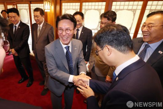 [서울=뉴스핌] 양윤모 기자 = 김민석 국무총리가 6일 오후 서울 종로구 삼청동 국무총리 공관에서 열린 이재명 정부 첫 고위당정협의회에서 참석자들과 인사를 나누고 있다. [공동취재] 2025.07.06 yym58@newspim.com
