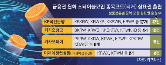 한편 한국은행이 CBDC를 사실상 포기하면서 은행은 물론 핀테크·게임업계도 원화 스테이블코인 상표권 출원 경쟁에 뛰어들고 있다. 특허청 키프리스에 따르면 이날 기준 토스뱅크(48건), 비바리퍼블리카(24건), 신한금융지주(21건), NHN KCP(21건), 다날(20건), 카카오페이(18건), KB국민은행(17건), 하나은행(16건), 케이뱅크·카카오뱅크·iM뱅크(12건), IBK기업은행(10건), 신한카드(8건), 네이버페이(5건) 넥써스(4건) 등이 상표권을 출원했다.